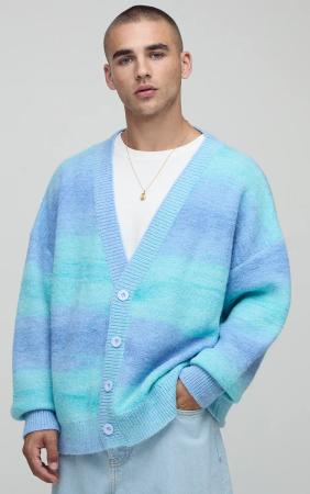 Oversized Boxy Fit Ombre Stripe Knitted Cardigan - Blue - S, Blue