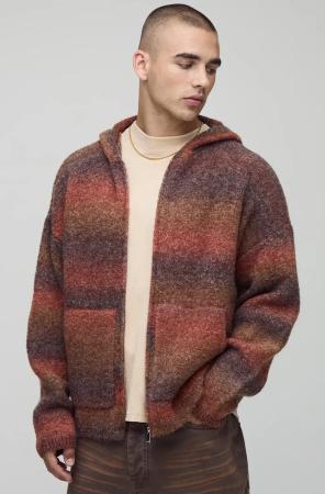 Oversized Boxy Fit Ombre Stripe Knitted Zip Through Hoodie - Orange - M, Orange