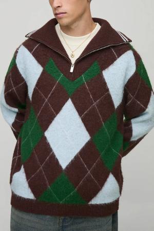 Regular Fit 1/4 Zip Funnel Neck Diamond Argyle Knitted Jumper - Chocolate - M, Chocolate