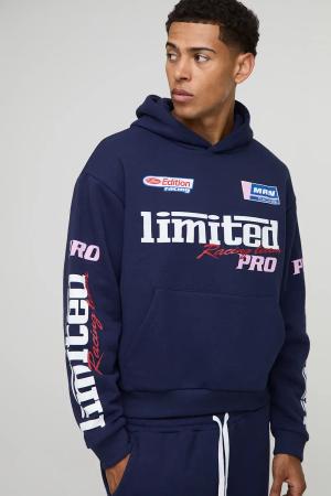 Kastiger Oversize Hoodie mit Moto-Print - Blau - L, Blau