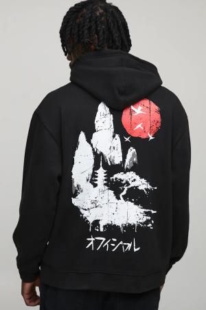 Tall Oversize Hoodie mit Landscape Rising Sun Print - Schwarz - 2XL, Schwarz