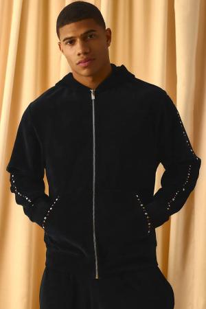 Verzierter Velour-Hoodie mit Reißverschluss - Schwarz - XS, Schwarz