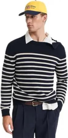 Herren Striped Cotton C-Neck Pullover, Evening Blue, L