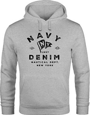Hoodie Herren Vintage Motiv Schriftzug Navy Denim Nautical New York Kapuzen-Pullover Männer grau XL