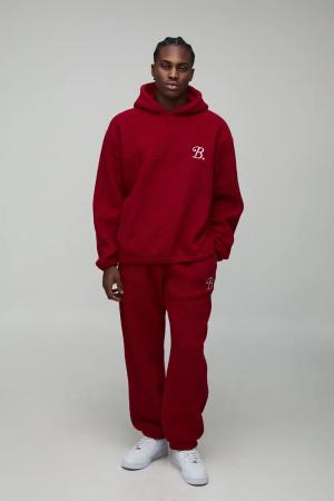Oversized Borg B Scroll Embroidered Hoodie & Cuffed Jogger Tracksuit - S, Red
