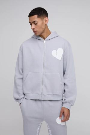 Kastiger Oversize Hoodie mit Herzen und Reißverschluss - Grau - S, Grau