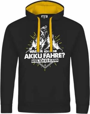Herren Kapuzenpullover mit Aufdruck Warum ich ohne Akku fahre - Weil ich es kann - Ride Bike, Größe:M, Farbe:schwarz/gelbe Kapuze