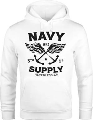 Hoodie Herren Motiv Maritim Nautical Design Schriftzug Navy Supply Anker mit Flügeln Kapuzen-Pullover Männer weiß 4XL