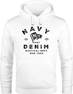 Hoodie Herren Vintage Motiv Schriftzug Navy Denim Nautical New York Kapuzen-Pullover Männer weiß M