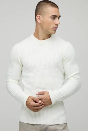 Muscle Fit Ribbed Knitted Jumper - Ecru - L, Ecru