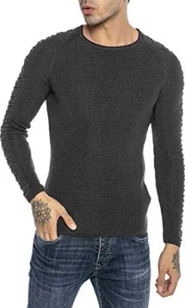 Herren Pullover Strick Pulli Langarm Rundhals Strickpullover mit ausgefallenem Arm Design im Biker Stil 325, Farbe:Anthrazit, Größe S-XXL:M