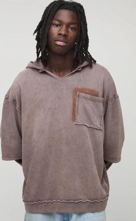 Coffee Oversized Stone Washed Raw Collar Pocket Hoodie - M, Coffee