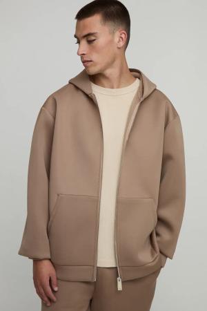 Oversized Bonded Scuba Zip Through Hoodie - Taupe - S, Taupe
