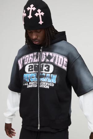 Oversized Boxy Spray Wash Puff Print Waffle Faux Layer Sleeve Zip Up Hoodie - Black - M, Black
