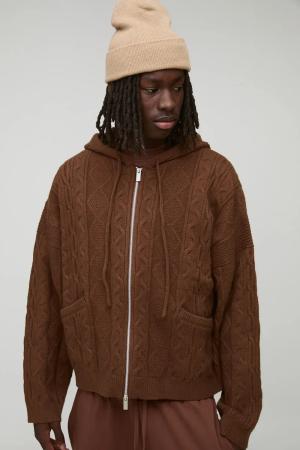 Oversized Zip Up Cable Knitted Hoodie - Stone - M, Stone
