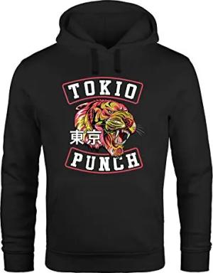 Hoodie HerrenTokio Punch Schriftzug Tigerkopf Print Tattoo Style Kapuzen-Pullover Männer schwarz-rot XL