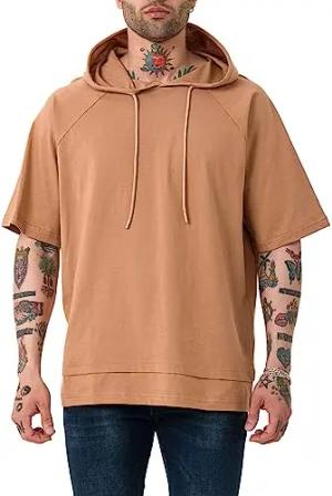 Herren T-Shirt Double Layer Oversized mit Kapuze Baumwolle Hellbraun S