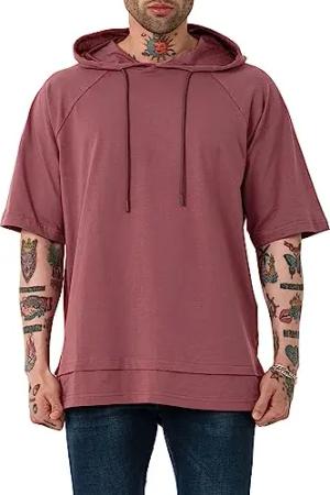 Herren T-Shirt Double Layer Oversized mit Kapuze Baumwolle Pflaume M
