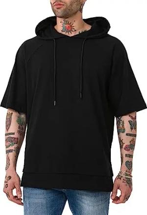 Herren T-Shirt Double Layer Oversized mit Kapuze Baumwolle Schwarz M