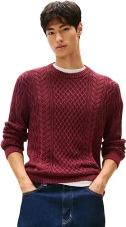 Herren Pullover Cable Knit Sweater mit Zopfmuster, Rot (Red Wine Tonal), S