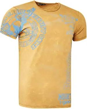 T-Shirt Herren Seitliche Knopfleiste Oxid Washed mit Individuellem Front Print Stretch Streetwear Freizeit-Shirt 194, Farbe:Camel, Größe:S