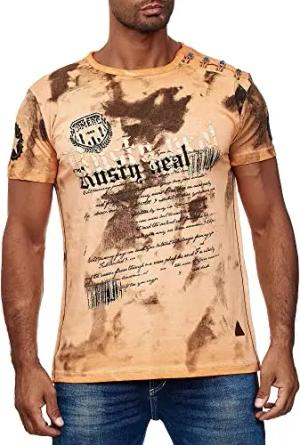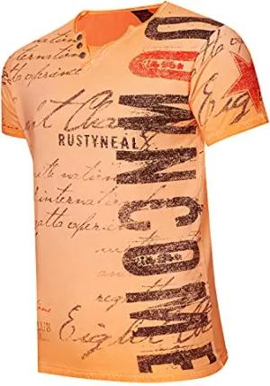 T-Shirt 'Rusty Neal' V-Neck mit Knopfleiste Verwaschen & Bedruckt Plakativer Seitlicher Logo Print Kurzarm 271, Farbe:Orange, Größe:L