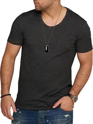 . Herren Kurzarm T-Shirt Washed Look mit Brusttasche V-Neck 4663-Schwarz-XL