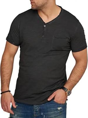 . Herren Kurzarm T-Shirt Washed Look mit Knopfleiste und Brusttasche V-Neck 4682-Schwarz-S