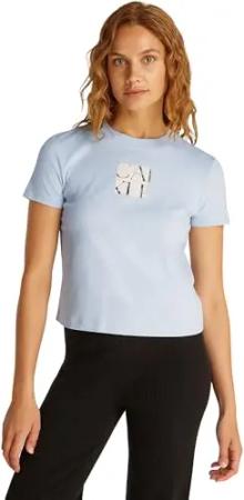 Damen T-Shirt Kurzarm Front Photo Graphic Baby Tee mit Rundhalsausschnitt, Blau (Niagara Mist), S