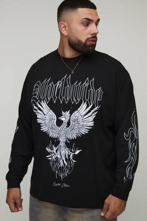 Plus langärmliges Oversize T-Shirt mit Print - Schwarz - 4XL, Schwarz