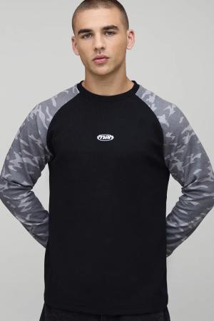 Regular Raglan Camouflage T-Shirt in Waffeloptik - Schwarz - S, Schwarz