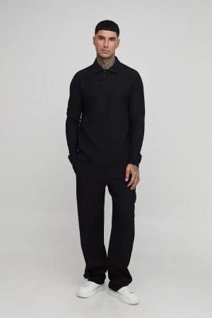Tall Pleated Regular Long Sleeve Polo & Relaxed Trouser Set - Schwarz - 2XL, Schwarz