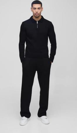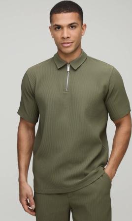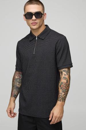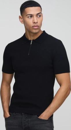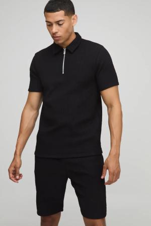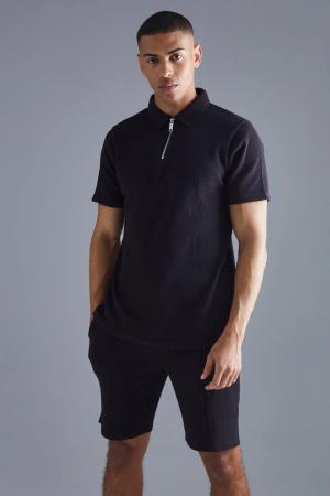 Strukturiertes geripptes Slim-Fit Poloshirt mit Reißverschluss & Shorts - Schwarz - XL, Schwarz
