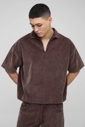 Kastiges Oversize Cord Poloshirt mit Acid-Waschung - Braun - S, Braun
