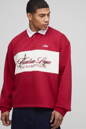 Kastiges Oversize Rugby-Poloshirt mit floraler Stickerei - Burgund - S, Burgund