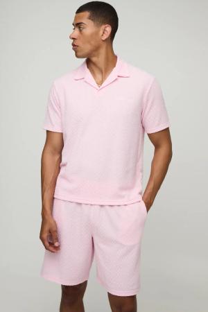 Kastiges strukturiertes Poloshirt mit Stickerei & lockere Shorts - Rosa - L, Rosa