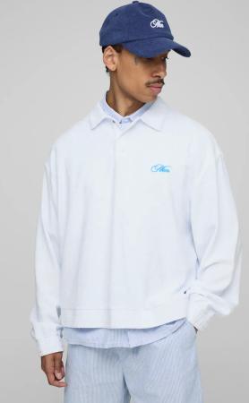Langärmliges kastiges Oversize Frottee-Poloshirt mit Man-Stickerei - Weiß - S, Weiß