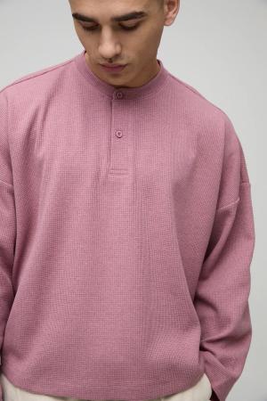 Langärmliges kastiges Oversize Oberteil in Waffeloptik mit Knöpfen - Gelb - L, Gelb