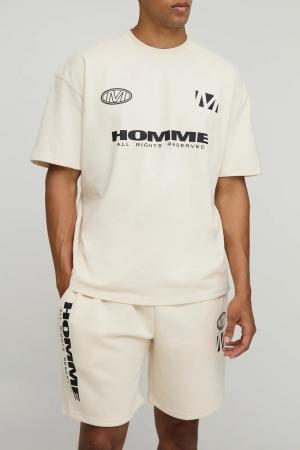 Oversize T-Shirt & Shorts mit Homme Moto Print - Ecru - S, Ecru