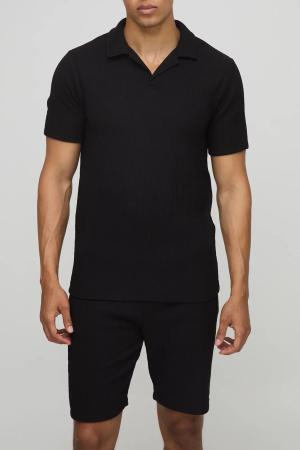 Strukturiertes geripptes Slim-Fit Poloshirt & Shorts - Schwarz - L, Schwarz