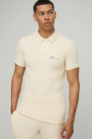 Strukturiertes Muscle-Fit Poloshirt mit Stickerei - Ecru - S, Ecru