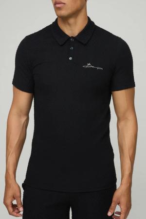 Strukturiertes Muscle-Fit Poloshirt mit Stickerei - Schwarz - XL, Schwarz