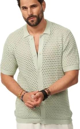Herren Poloshirt Crochet Kurzarm Cardigan Knit Strick-Polo T-Shirt Freizeit Männer Polo-Hemd Men's Sommer-Fit S2_Balm-Sage-M