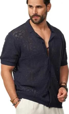Herren Poloshirt Crochet Kurzarm Cardigan Knit Strick-Polo T-Shirt Freizeit Männer Polo-Hemd Men's Sommer-Fit S2_Balm-Navy-XXL