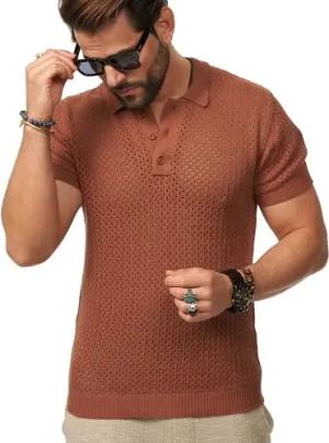 Herren Poloshirt Crochet Kurzarm Knit Strick-Polo T-Shirt Freizeit Männer Polo-Hemd Men's Sommer-Fit S2_Cavern-Brown-M