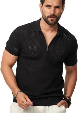 Herren Poloshirt Kurzarm Knit Feinstrick-Polo T-Shirt Freizeit Half-Zip Männer Polo-Hemd Men's Fit S2_WATA-Black-L