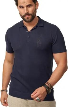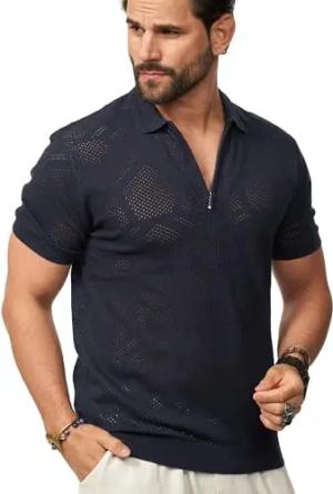 Herren Poloshirt Crochet Kurzarm Cardigan Knit Strick-Polo T-Shirt Freizeit Männer Polo-Hemd Men's Sommer-Fit S2_Balm-Navy-M
