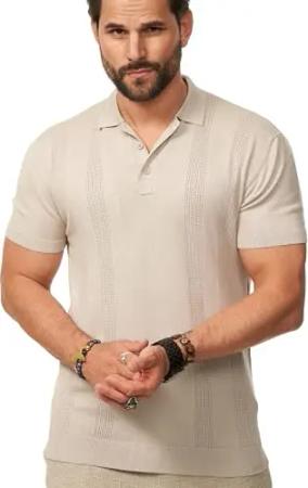Herren Strick Poloshirt Kurzarm T-Shirt Polo-Hemd Knit Oberteil mit Knopfleiste Strick-Polo Golf-Polo Tennis-Polo mit Kontrast-Stripes S2_KP-101-Stone-XXL