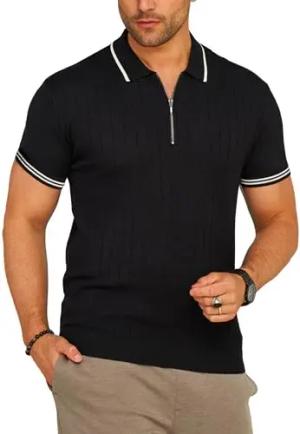 Herren Strick Poloshirt Kurzarm Gerippt T-Shirt Polo-Hemd Knit Oberteil mit Zipper-Kragen Kontraststreifen S2_KP-102-Black-M