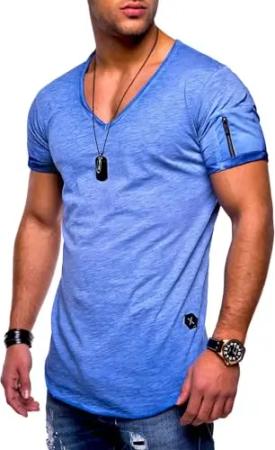 Herren T-Shirt V-Ausschnitt Kurzarm Oversized Basic Zipper Male Tee aus Baumwolle Leichtes V-Neck Oberteil Blau-Wash-S